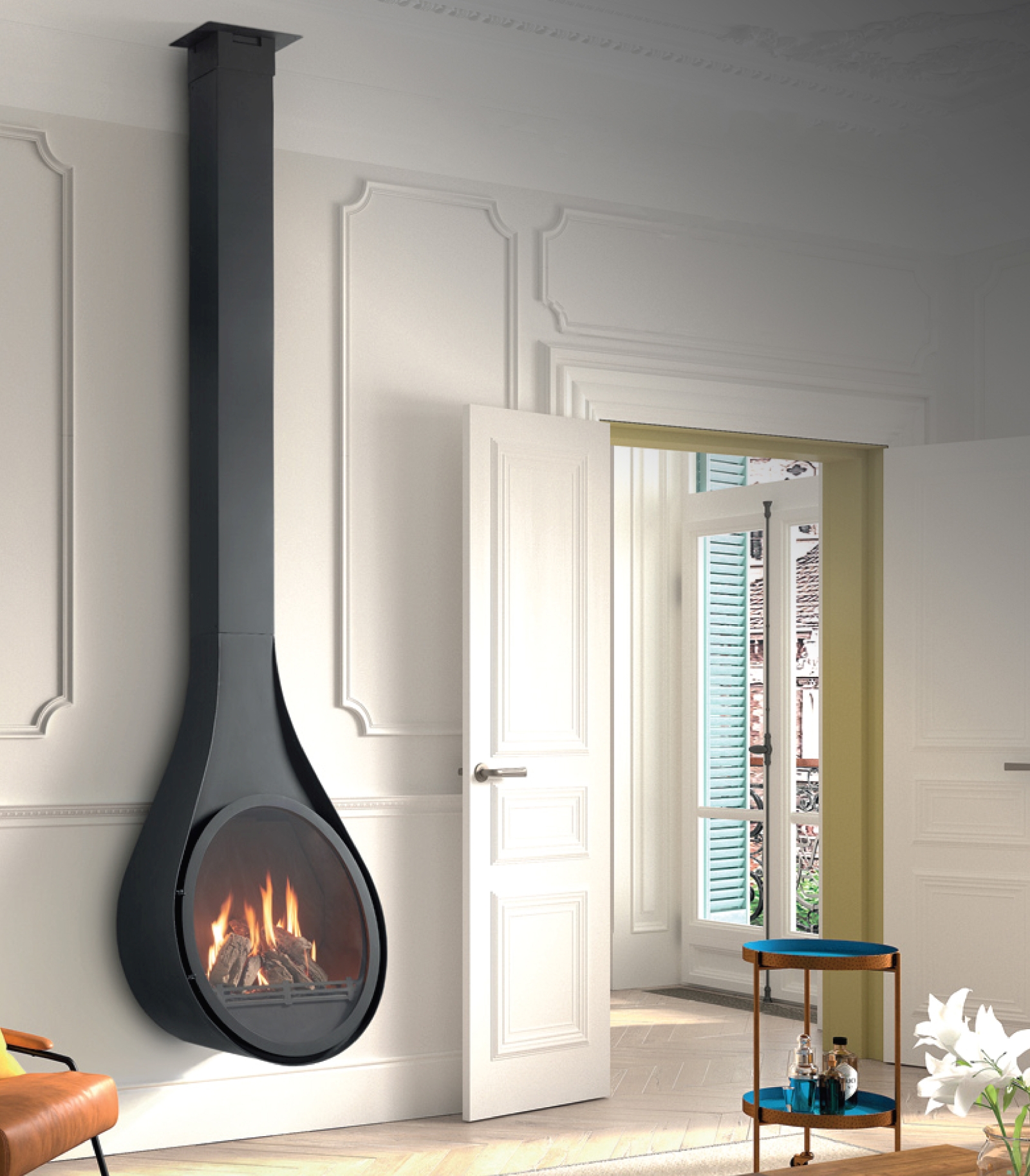 DROP uchycený na stěně se vznáší nad podlahou jako černý objekt – lehký, a přesto stabilní. Podněcuje fantazii architekta a otevírá nové možnosti pojetí zdi a prostoru. To, jak krb začlení, určí atmosféru interiéru.