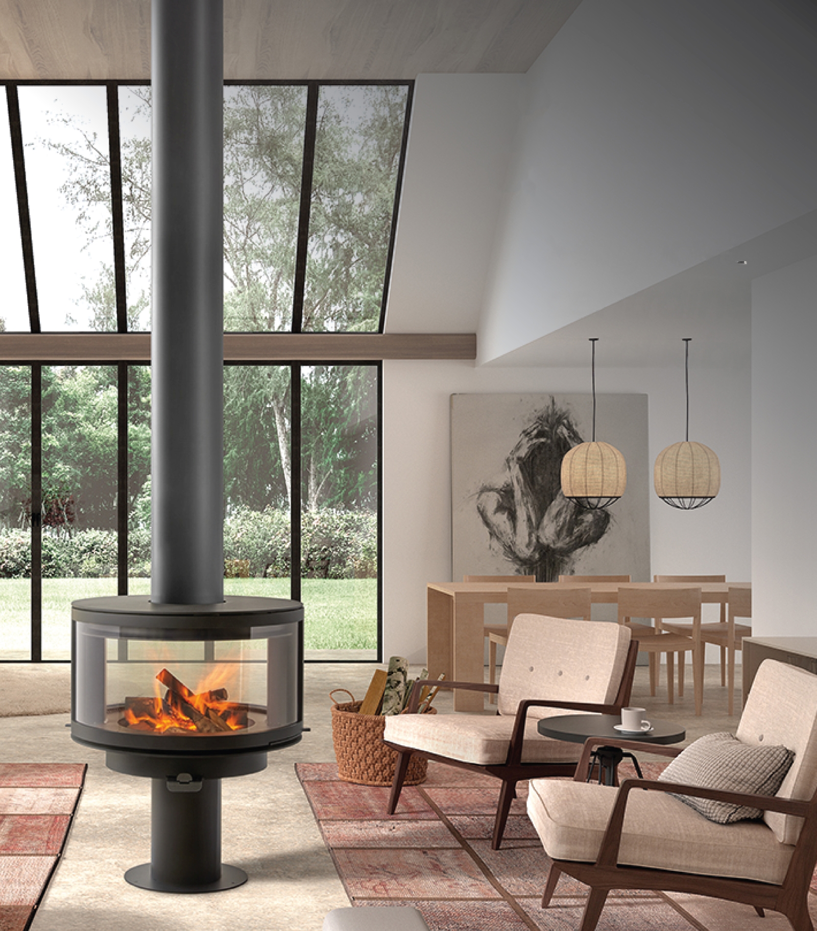 Řada RONDE zaujme kulatou spalovací komorou, čistým napojením na kouřovod a jemně klenutým panoramatickým sklem. Nabízí pohled na plameny skrze 360° skleněná okna a působí jako stylizovaný oltář ohně – ať už je ve variantě zavěšený ze stropu, připevněný ke stěně, nebo usazený na subtilním podstavci. Je to tichý rival televize – místo pohyblivého obrazu nabízí soustředěný zážitek světla a klidu. Ruční finiš a řemeslné detaily podtrhují jeho kvalitu.