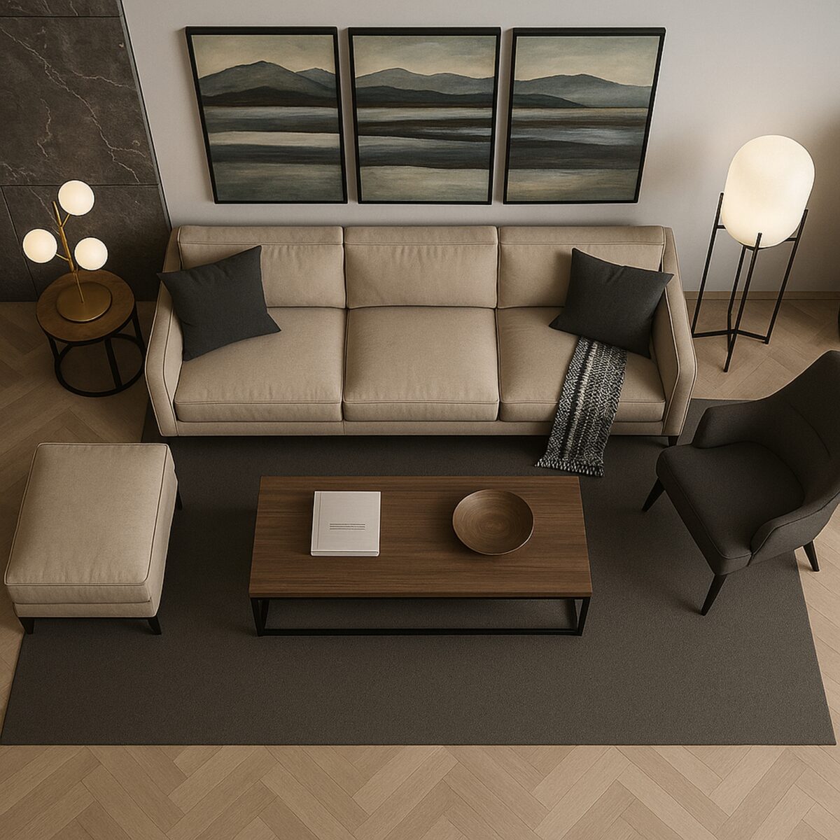 Prompt: Vytvoř úplně stejný render. Nesmíš změnit nic. Pouze úhel pohledu. Vytvoř obrázek tak, jako bychom se na místnost dívali shora.