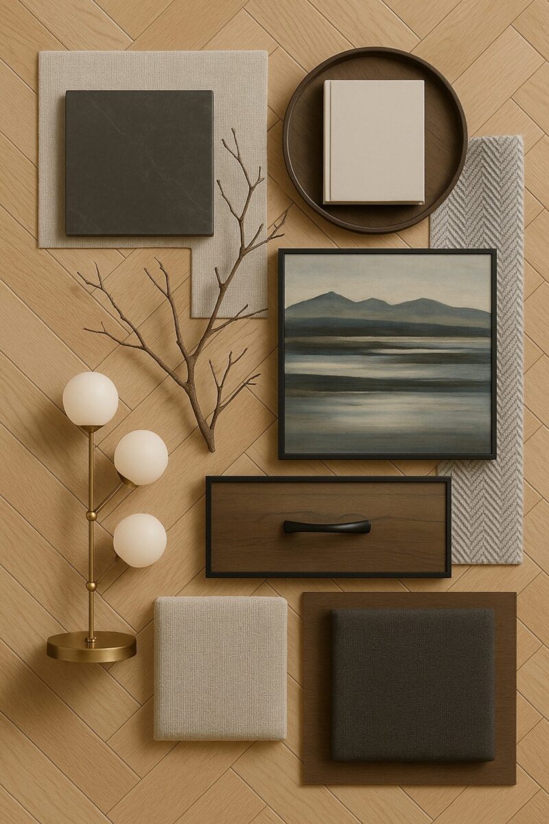 Prompt: Vytvoř moodboard z materiálů vyskytujících se na této vizualizaci.