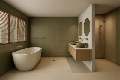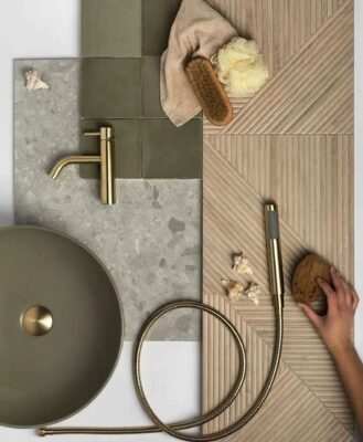Prompt by pak mohl znít například takto: Obrázek 1 je vizualizace koupelny ve Sketch Upu. Obrázek 2 je moodboard s materiály a barvami. Vytvoř na základě vizualizace vysoce kvalitní render s použitím materiálů z moodboardu. Neměň žádné detaily ve vizualizaci a zachovej veškerou geometrii.